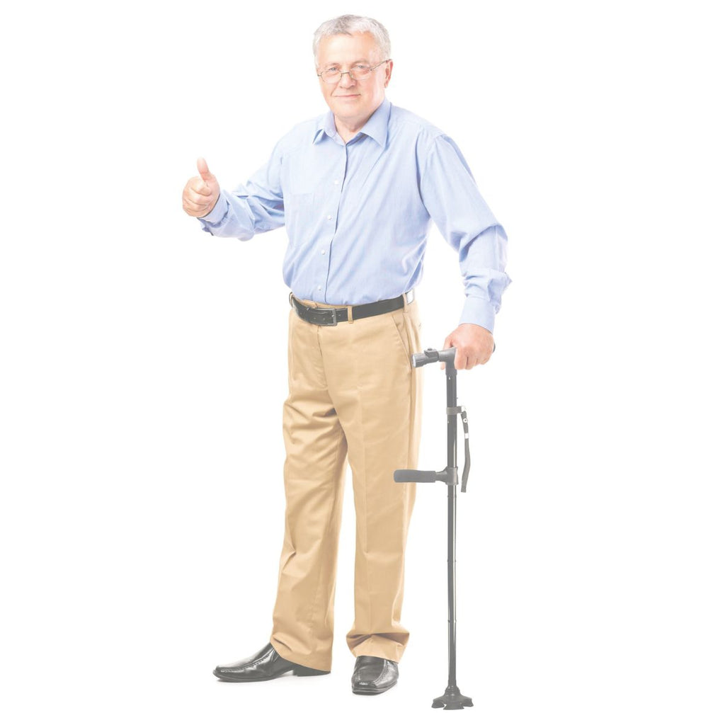 Können Sie nicht mehr ganz stabil stehen, haben Sie Schwierigkeiten beim Gehen oder haben Sie eine Verletzung an Ihren Beinen? Dann ist der Clever Cane, ein faltbarer und verstellbarer Gehstock, genau das Richtige für Sie! Gehstock mit Dreibein Wenn Sie auf ein Hilfsmittel wie einen Gehstock angewiesen sind, um zusätzliche Unterstützung und Stabilität zu erhalten, ist es sehr wichtig, dass er fest auf dem Boden steht. Der Clever Cane hat ein 3-Punkt-Stativ mit rutschfesten Kappen. Das macht ihn anpassungsfähig an jedes Gelände. Außerdem hat der Gehstock zwei ergonomische Griffe und eine Handschlaufe für zusätzlichen Halt. Der zweite, abgesenkte Griff bietet zusätzlichen Halt, wenn Sie von einem Sofa oder Stuhl aufstehen möchten. Sicher gehen Der Gehstock ist sogar mit einer drehbaren LED-Lampe ausgestattet, damit Sie auch im Dunkeln gut sehen können. Wenn Sie sich nicht sicher fühlen, können Sie den Alarm an der Seite des Griffs benutzen. Außerdem lässt sich der Clever Cane leicht zusammen- und auseinanderfalten und kann überallhin mitgenommen werden. Darüber hinaus ist der Gehstock in der Höhe von 86 bis 96 cm verstellbar. Geeignet für ein maximales Gewicht von 105 kg - Nicht bei Eis oder Glätte verwenden - Nicht für medizinische Zwecke geeignet.