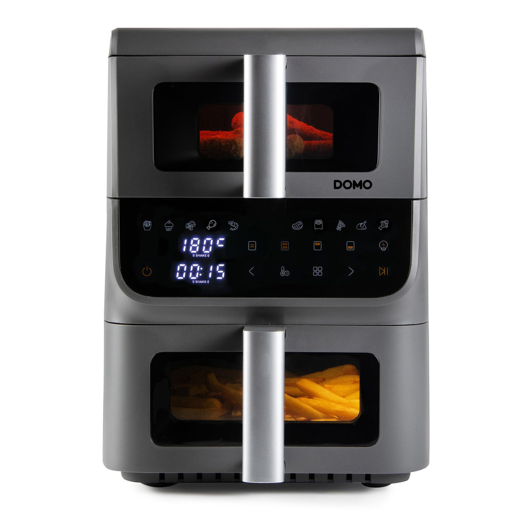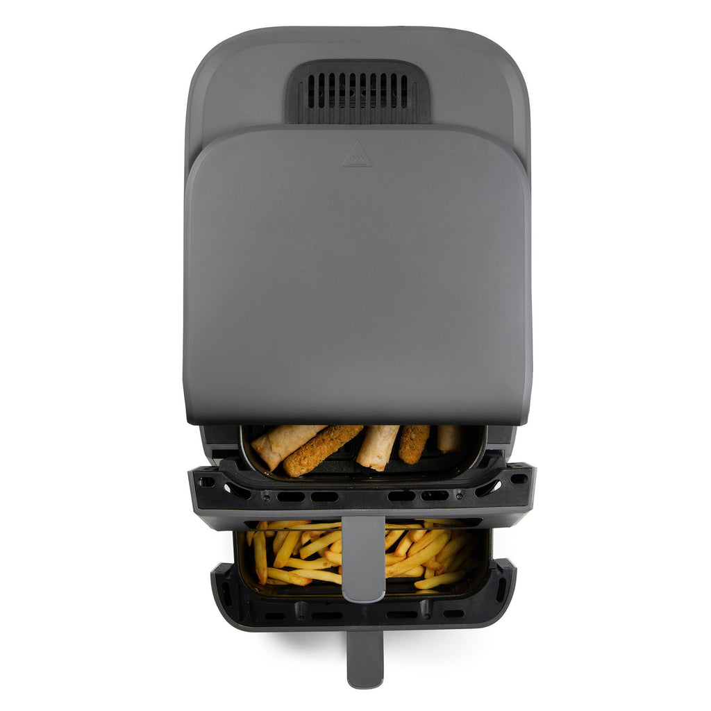 minimalem Platzbedarf. Mit zwei übereinanderliegenden Frittierkörben und